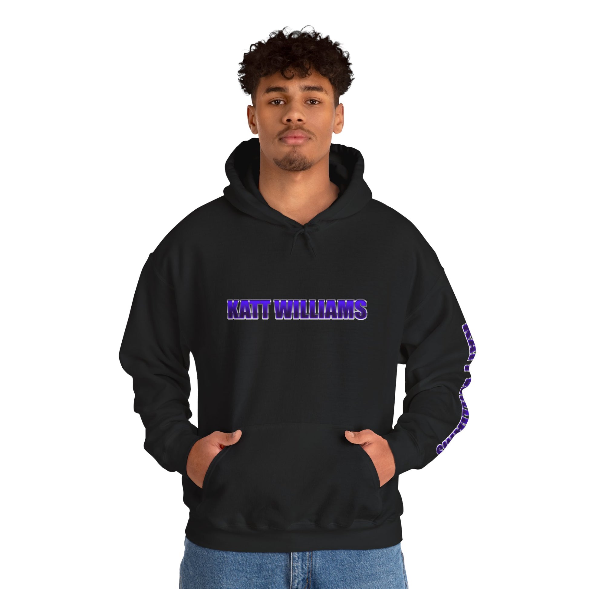This heavyweight hooded sweatshirt feels like an instant go-to—soft, warm, and made to be worn often. The black fabric makes a bold backdrop for vibrant purple text across the chest and down one sleeve, while the back features a collage-style graphic and a signature-style script beneath it. The roomy kangaroo pocket, double-lined hood and color-matched drawcord add everyday utility and a finished look. It drapes comfortably in a classic fit that layers easily over tees and long-sleeves, carrying a confident, music‑and‑stage vibe that stands out without shouting.