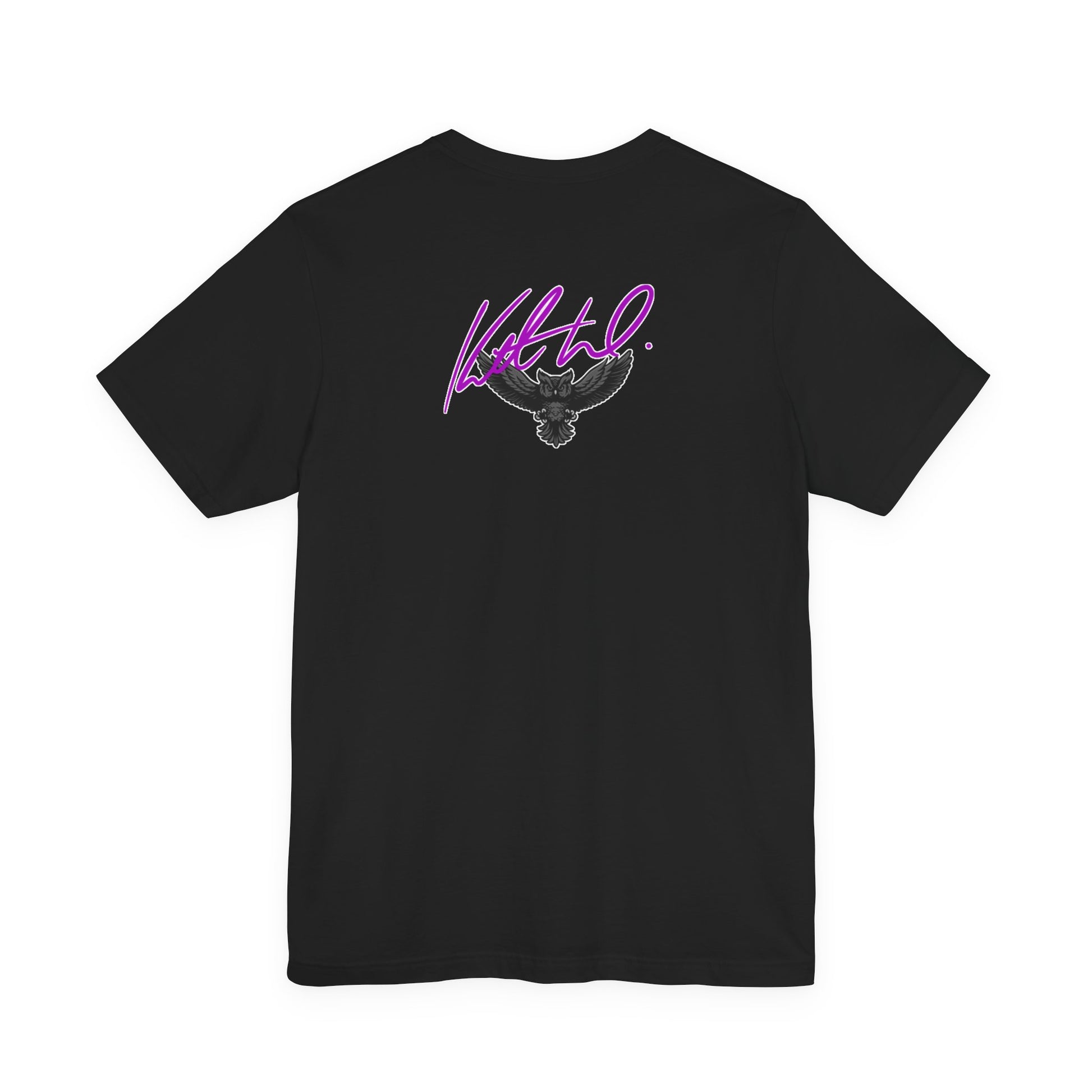 This lightweight jersey tee carries bold personality without shouting. A colorful, comic-style portrait on the front freezes a snap reaction — wide eyes, raised hand, and a neon speech banner spelling out “DAFUQQ?!” — while the upper back bears a hand-written purple signature and a small winged emblem. The shirt feels like a wearable punchline: cheeky, sharp, and designed to start conversations. Soft, breathable cotton drapes easily under a jacket or on its own, and the crew neckline keeps the look clean so the art stays front-and-center. Wear it to laugh with friends, to break the ice at a show, or to add a little attitude to an ordinary day.